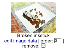 "edit image data" takes you to the data editing form for that image order: lower values move an image up, higher values move an image down, images with the same value are arranged in the order that they were uploaded. remove: Checking the box removes the image from the exhibit, the image will only be removed from the exhibit and not deleted from the database.